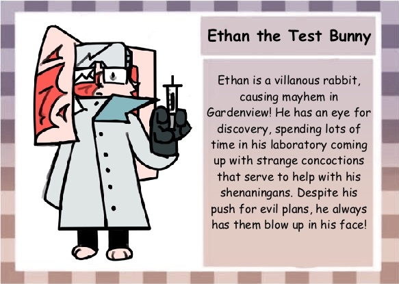 Ethan has a habit of picking at his scars or playing with his ridiculously large ears. He has an evil laugh that he occasionally lets slip on accident. Ethan has a slight stuttering problem. He also has a tendency to stomp his feet when he’s particularly upset (heheh, get it, because he’s a rabbit).